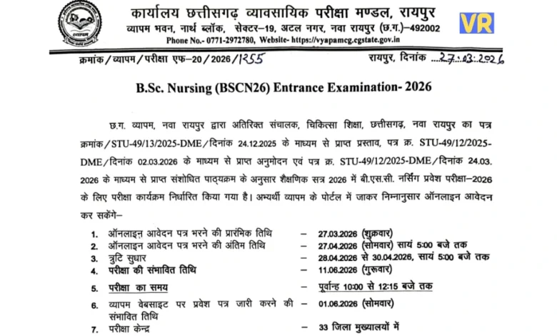 रायपुर। छत्तीसगढ़ में नर्सिंग स्नातक (बीएससी नर्सिंग) पाठ्यक्रम में दाखिले के लिए आयोजित होने वाली प्रवेश परीक्षा का कार्यक्रम जारी कर दिया गया है। राज्य का व्यावसायिक परीक्षा मंडल (व्यापम) इस बार भी परीक्षा का आयोजन करेगा। इच्छुक उम्मीदवार अब ऑनलाइन आवेदन कर सकते हैं।
