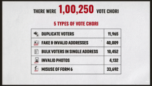 फर्जी पते: 40,009 वोटर कार्ड पर अवैध पते (जैसे हाउस नंबर ‘0’, अजीब पिता के नाम)। एक ही कमरे में 50-80 लोगों का पता दर्ज। पड़ताल करने वालों को धमकियां दी गईं।